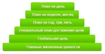 Это фундамент пирамиды. Их ясное определение для себя, задает вектор направленности жизни. Какой вы видите свою жизнь? Чего хотите от нее получить? Какой след после себя хотели бы оставить?